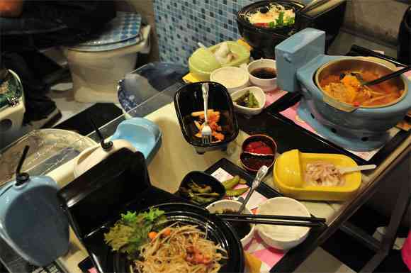 Del mismo modo, se pueden observar prácticamente en todos lados las iniciales que distinguen al lugar, es decir, “WC”. Incluso, como el restaurant cuenta con hasta tres plantas de alto, la cantidad de gente que se agolpa es realmente impresionante. La mayoría de estos clientes comen en mini inodoros y mini bañeras de plástico, y luego, se limpian sus manos y boca con papel higiénico colgado cerca de sus mesas, que en realidad tampoco lo son.